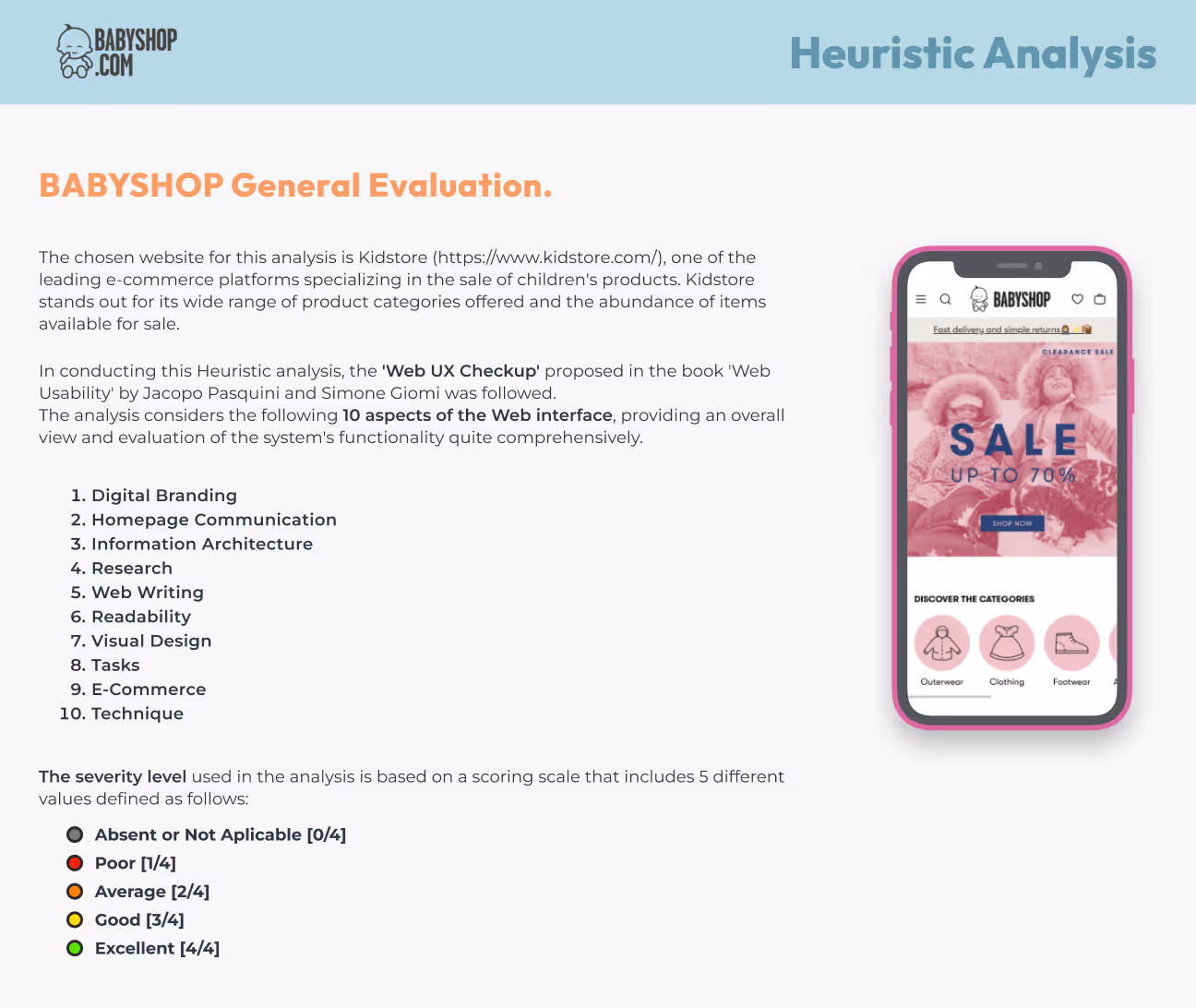 I followed the Web UX Checkup checklist from Web Usability by Pasquini and Giomi, examining 10 key areas of the user experience: