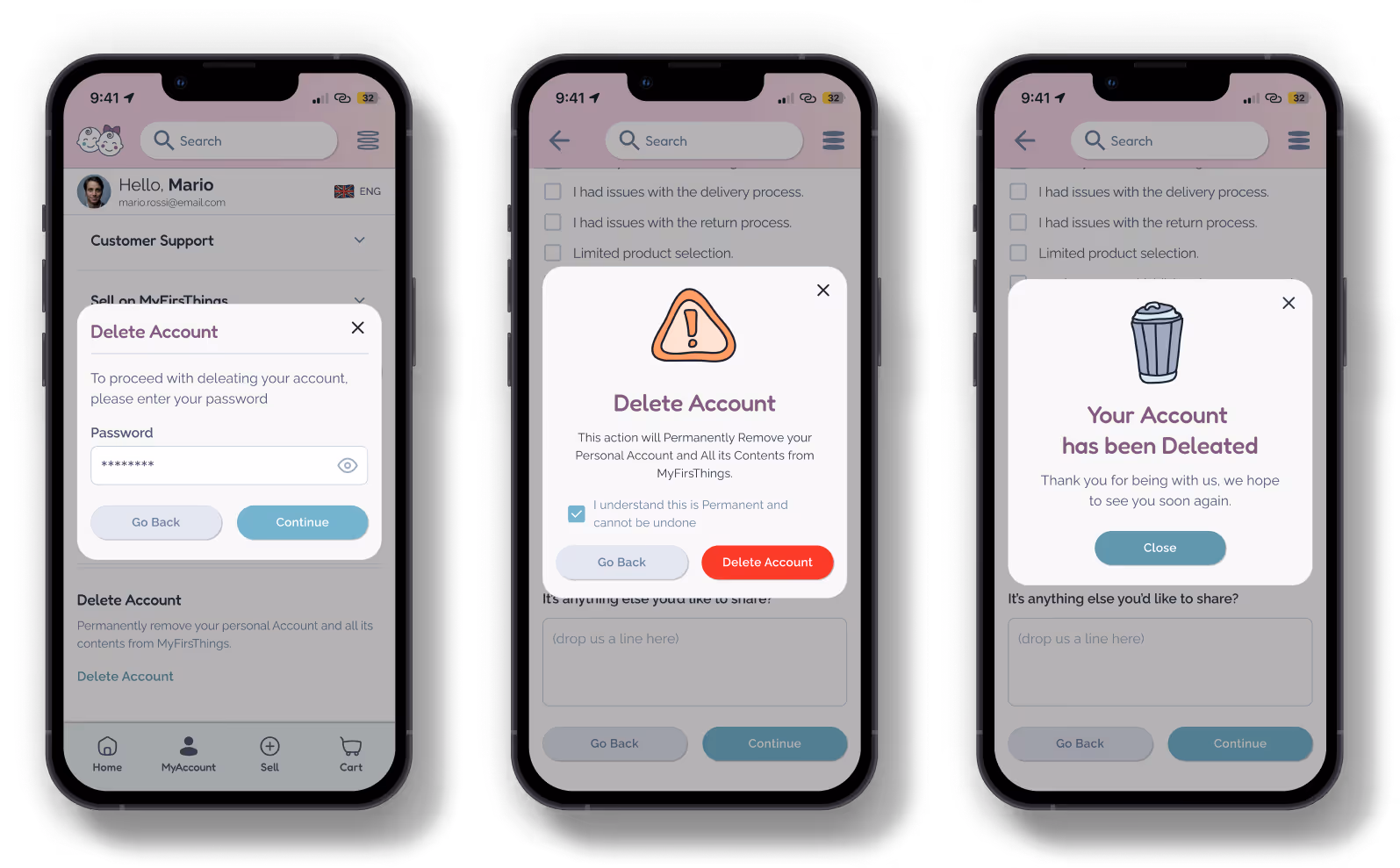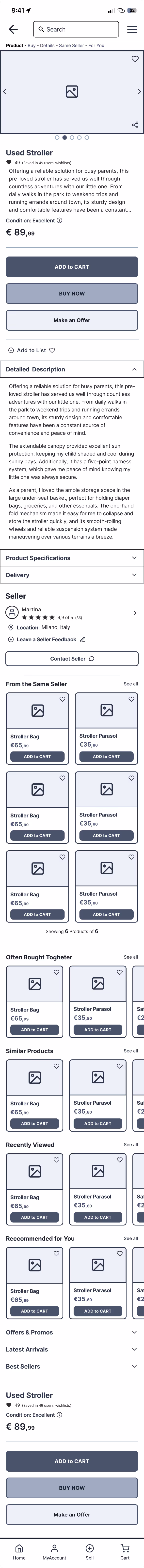 After designing over 75 detailed mockups, it was time to make them move, react, and guide the user journey. Using Figma, I built high-fidelity interactive prototypes to simulate real user flows — from product search to purchase, from selling an item to managing personal settings.